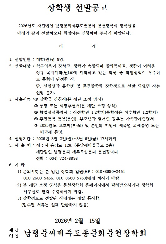 2026년도 (재)남평문씨제주도종문회 문천장학회 장학생 모집공고 문천장학회 0 120 02.15 12:23 2026.02.15 12:32 장학생 선발공고.pdf (50.2K) + 12 2026.02.15 12:23 장학생신청서양식.hwp (42.0K) + 24